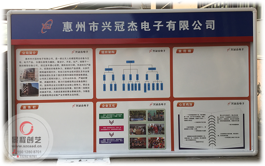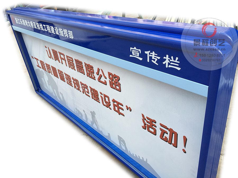 在深圳做一个企业文化宣传栏要多少钱?深圳景程创艺广告有限公司专业设计制作企业、公司、单位宣传栏公告栏制作,深圳常见的宣传栏公告栏主要有不锈钢带玻璃门的宣传栏、铝合金型材制作而成的宣传栏、还用焊接烤漆成型的宣传栏等!宣传栏一般都建在小区、公司、企业的出入口或文化广场、活动中心、公路沿街或会所附近等,这让我们无法回避,进行被动阅读。 当今社会是一个信息时代,公众获悉信息的渠道可谓五花八门,宣传栏的作用不可忽视。